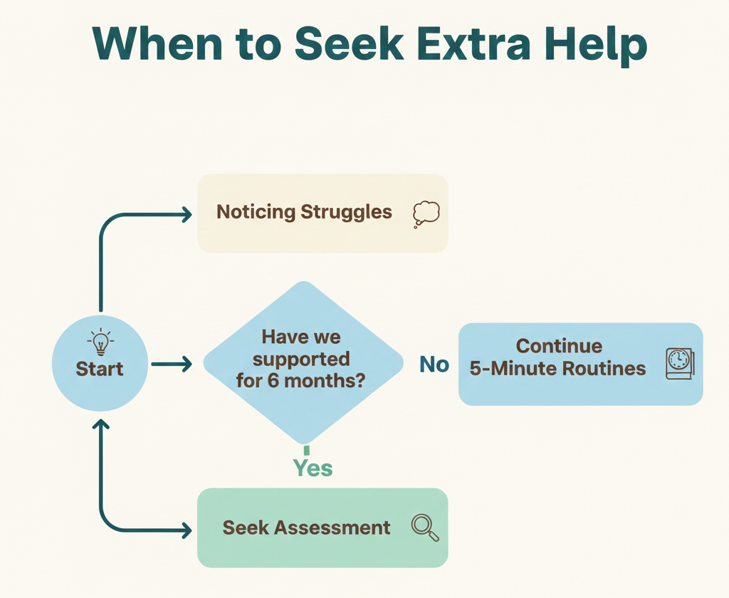 - Assess the Gap: If struggles last six months or more despite consistent home support, an assessment can pinpoint the exact learning issue.