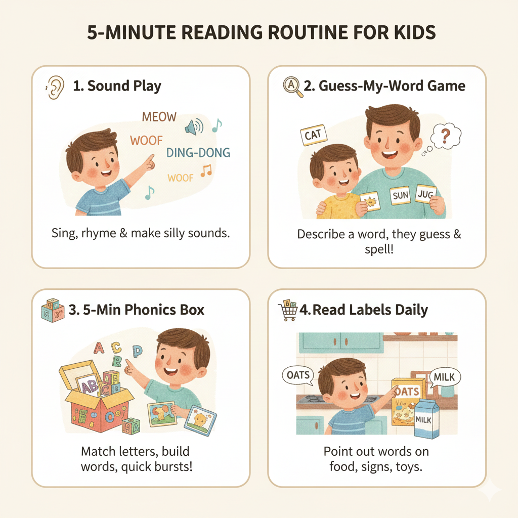 - Daily Doses: Consistency beats long, stressful sessions. Use fun, 5-minute routines focused on sounds and sight words.