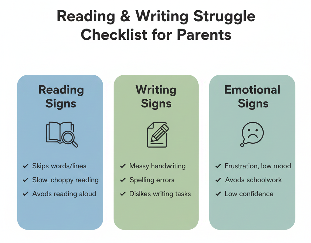- Avoidance: Frequent frustration, avoidance, or meltdowns related to reading or writing homework.